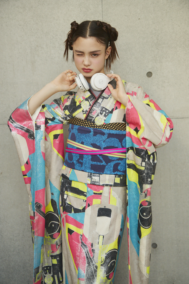 首からかけているだけでも、振袖の「静」なイメージに、ヘッドフォンの「動」や「カルチャー」のイメージが加わり、不思議なオーラを放ちます。